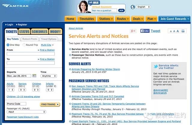 這是美國國家鐵路公司Amtrak的網(wǎng)站,上面同樣可以快速地查到各項信息。其他鐵路系統(tǒng)的類似信息也都可以在各自網(wǎng)站上找到。[page]