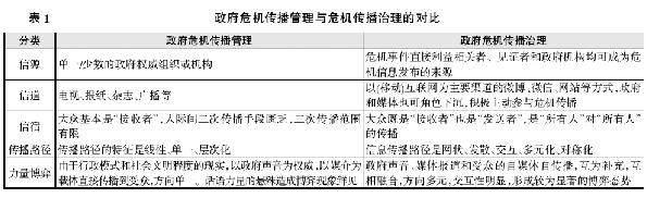 正是由于新媒體的廣泛而深刻影響,政府危機傳播的傳統(tǒng)層次模型應(yīng)該得以修正,以“生態(tài)模型”來重新認知新媒體環(huán)境下的危機傳播主體及其交互模式,在生態(tài)模型指導之下,政府危機傳播策略也應(yīng)該逐步從“危機管理”過渡到“危機治理”。下文表1針對危機傳播應(yīng)對涉及的多個方面進行了比較。