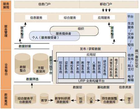 在業(yè)務(wù)流程層面,復(fù)旦大學(xué)針對(duì)用戶在校管理服務(wù)的生命周期,做了本科生、研究生、教職工的生命周期的業(yè)務(wù)梳理,優(yōu)化管理環(huán)節(jié),以“一站式”服務(wù)的形式規(guī)劃了若干業(yè)務(wù)場(chǎng)景,包括將同質(zhì)化服務(wù)進(jìn)行歸并,如成績(jī)單、在職證明、戶籍證明等各類公證證明的打印,合并辦理本科生與研究生的獎(jiǎng)、勤、助、貸、補(bǔ)的申請(qǐng)與發(fā)放;按業(yè)務(wù)特定人群劃分服務(wù)群,如出國(guó)出境事務(wù)、迎新、就業(yè)、離校等服務(wù)的集中辦理等。對(duì)歸并后的服務(wù)基于底層數(shù)據(jù)進(jìn)行整合,根據(jù)屬性信息分發(fā)到不同業(yè)務(wù)系統(tǒng)、不同環(huán)節(jié)中進(jìn)行后續(xù)管理實(shí)現(xiàn)流程的優(yōu)化,其重點(diǎn)是簡(jiǎn)化個(gè)人的工作,改善部門間的協(xié)同方式。在數(shù)據(jù)整合層面的設(shè)計(jì)中,面對(duì)異構(gòu)的數(shù)據(jù)源,通過ETL抽取、數(shù)據(jù)同步、跨庫視圖、數(shù)據(jù)導(dǎo)入等數(shù)據(jù)同步機(jī)制將數(shù)據(jù)以統(tǒng)一的標(biāo)準(zhǔn)和表結(jié)構(gòu)進(jìn)行重組,適應(yīng)業(yè)務(wù)協(xié)作流程的需要。
