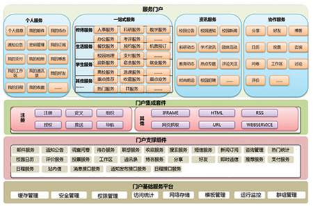 建設(shè)信息化“一站式”服務(wù)中心,需要對(duì)服務(wù)的屬性進(jìn)行統(tǒng)一的規(guī)劃,所有服務(wù)有規(guī)范的接入標(biāo)準(zhǔn),在服務(wù)中心進(jìn)行統(tǒng)一的注冊(cè)和管理。復(fù)旦大學(xué)在服務(wù)組件的設(shè)計(jì)上注重標(biāo)準(zhǔn)化、組件化、層次化和平臺(tái)化,將大大小小的業(yè)務(wù)職能和支撐功能抽象成不同層次的服務(wù),每項(xiàng)服務(wù)無論粒度粗細(xì)都封裝了一定的業(yè)務(wù)邏輯,對(duì)外暴露的僅是數(shù)據(jù)的輸入和效果的輸出,這種封裝方式使得服務(wù)的新增、升級(jí)、替換都相對(duì)簡(jiǎn)單,服務(wù)模塊的利用率和易用性都很高,管理簡(jiǎn)單易行。門戶支撐組件為“一站式”服務(wù)提供了標(biāo)準(zhǔn)的公共服務(wù)平臺(tái)接口。