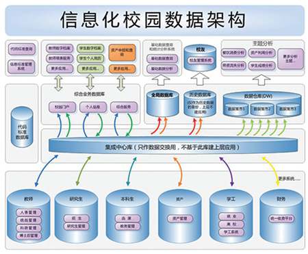 數(shù)據(jù)集成的作用是為整個(gè)“一站式”服務(wù)框架建立基礎(chǔ)的、權(quán)威的數(shù)據(jù)源。數(shù)據(jù)集成依托信息化校園數(shù)據(jù)中心,采用數(shù)據(jù)交換工具,將運(yùn)行過程中逐步積累的數(shù)據(jù)整合、抽取和同步置入綜合服務(wù)數(shù)據(jù)庫,并通過數(shù)據(jù)篩選、轉(zhuǎn)換,將來源于業(yè)務(wù)系統(tǒng)的數(shù)據(jù)按業(yè)務(wù)流程或職能分工組織改變?yōu)橐匀?、?cái)、物等主題組織,形成完整、獨(dú)立的主題數(shù)據(jù)庫,讓師生能夠方便地使用與自己相關(guān)的個(gè)人綜合業(yè)務(wù),讓院系能夠方便地查詢自己部門的人事、教學(xué)、科研等綜合情況,并為跨部門業(yè)務(wù)提供數(shù)據(jù)封裝和應(yīng)用接口。