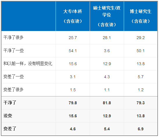調(diào)查顯示,不同學(xué)歷網(wǎng)民認(rèn)為近兩年網(wǎng)絡(luò)輿論環(huán)境變干凈的比例均在80%左右。其中,碩士研究生學(xué)歷網(wǎng)民(81.8%)的這一比例略高于博士研究生學(xué)歷網(wǎng)民(79.3%)和大專/本科學(xué)歷網(wǎng)民(79.8%)。