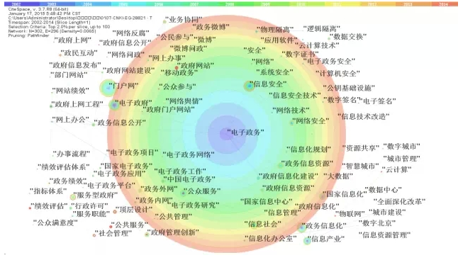 圖1CNKI(2002-2014)電子政務(wù)研究的共詞網(wǎng)絡(luò)圖譜