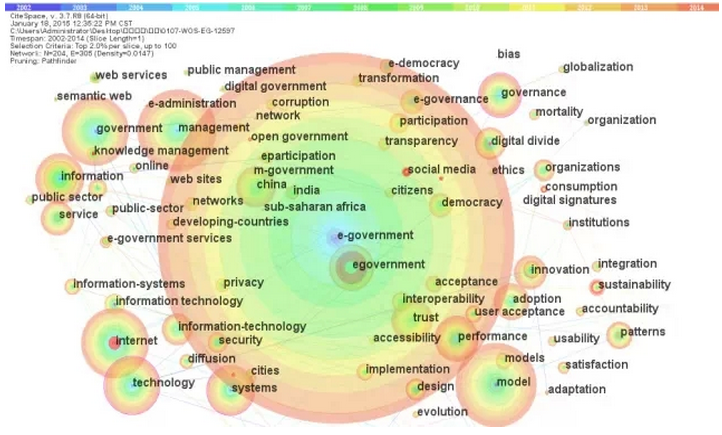 圖2Web of science(2002-2014)電子政務(wù)研究的共詞網(wǎng)絡(luò)圖譜