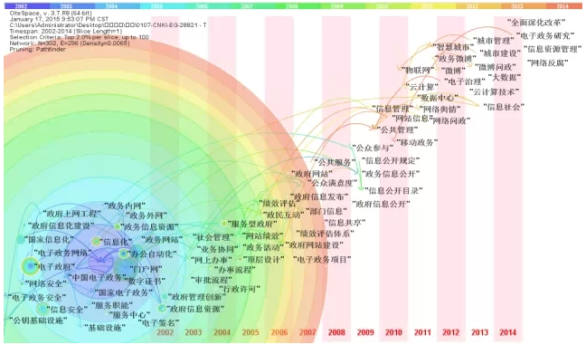圖3CNKI(2002-2014)電子政務(wù)研究共詞的時區(qū)視圖