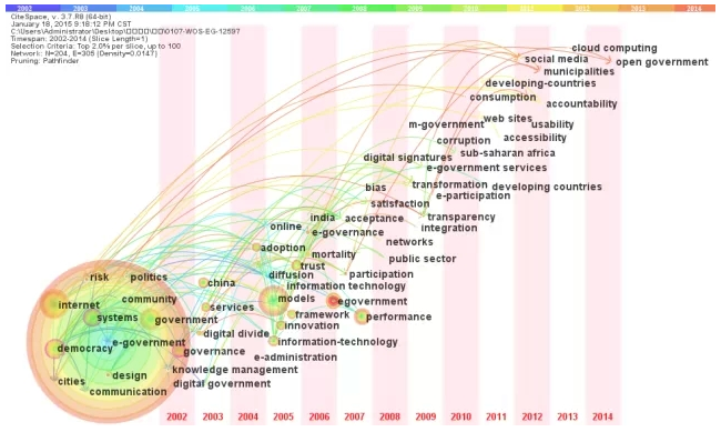圖4Web of Science(2002-2014)電子政務(wù)研究共詞的時區(qū)視圖