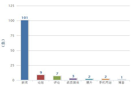 截止3月12日,新華網(wǎng)網(wǎng)絡(luò)輿情服務(wù)平臺從新聞、論壇、博客、評論、紙質(zhì)媒體、視頻、手機(jī)網(wǎng)站等各個(gè)類型的數(shù)據(jù)進(jìn)行監(jiān)測,結(jié)果顯示數(shù)據(jù)總量約為125篇,其中新聞?lì)愋偷臄?shù)據(jù)最多,約為101篇。人民網(wǎng)網(wǎng)站有12篇,中國新聞網(wǎng)網(wǎng)站有8篇,南方網(wǎng)網(wǎng)站有5篇。