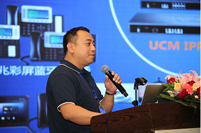 圖為潮流網(wǎng)絡(luò)全球產(chǎn)品總監(jiān)Richard Huang現(xiàn)場(chǎng)演講,潮流UCM一站式企業(yè)通信解決方案覆蓋30到2000門IPPBX規(guī)模,供應(yīng)業(yè)界最齊全的IP通信終端產(chǎn)品,包括百兆超高性價(jià)比IP電話、千兆高性價(jià)IP電話、千兆彩屏中高端智能電話、安卓視頻智能電話、無繩IP電話、軟電話、高清會(huì)議電話、高清視頻會(huì)議系統(tǒng)、綜合語音網(wǎng)關(guān)、NVR服務(wù)器、SIP攝像頭,除此之外,潮流建立了生態(tài)圈云端業(yè)務(wù)平臺(tái),包括終端重定向自動(dòng)部署云服務(wù)、視頻會(huì)議云穿透服務(wù)、安卓企業(yè)APP商城應(yīng)用服務(wù),從云端到系統(tǒng)平臺(tái)到IP終端,給中國企業(yè)用戶提供語音、視頻、監(jiān)控、存儲(chǔ)、智能、移動(dòng)等綜合應(yīng)用一站式統(tǒng)一通信解決方案。