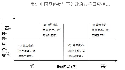 通過以上對四種網(wǎng)絡(luò)參與下政府決策回應(yīng)模式及典型案例考察,可以發(fā)現(xiàn),一旦問題出現(xiàn),如果出現(xiàn)網(wǎng)民參與、政府不予回應(yīng)的鴕鳥模式,或者民意先發(fā)、政府被動回應(yīng)的杜鵑模式都將導(dǎo)致嚴(yán)重后果,造成政府形象的不佳和公信力降低,政府主動、民意直接參與的蜂王模式可實(shí)現(xiàn)網(wǎng)絡(luò)參與和政府決策之間從沖突走向協(xié)商。因而問題出現(xiàn)后政府應(yīng)避免出現(xiàn)網(wǎng)民參與、政府不予回應(yīng)的鴕鳥模式,盡量減少民意先發(fā)、政府被動回應(yīng)的杜鵑模式,更多地倡導(dǎo)政府主動、民意直接參與的蜂王模式,實(shí)現(xiàn)網(wǎng)絡(luò)參與和政府決策之間從沖突走向協(xié)商。為預(yù)防事件發(fā)生,當(dāng)前較為合理的是政府主動、提前公開方案的蜂王模式。但良好的政府決策應(yīng)該追求政策的穩(wěn)定性和預(yù)見性,政府主動、提前公開方案的決策模式雖有所成效,卻還是沒有更好地解決網(wǎng)民與政府這兩個主體在政府決策中的互動,參與積極性不高的問題。最新《新世紀(jì)》雜志的評論文章指出,面對市場經(jīng)濟(jì)激發(fā)起來的公民權(quán)利的覺醒,各級政府都要學(xué)會“用對話、談判和協(xié)商的辦法化解利益矛盾”,并創(chuàng)造一種機(jī)制,使官民互動程序化。[34]而且更重要的是中國目前網(wǎng)絡(luò)參與下政府決策回應(yīng)模式上基本都是非制度化的、非常態(tài)化的,而且未能解決深層次的問題與矛盾,結(jié)果政府成了救火隊(duì),疲于應(yīng)對各種危機(jī)事件與群體性事件。