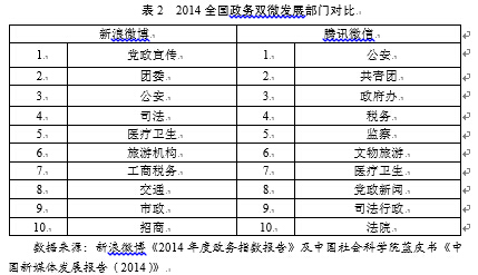 2014年政務(wù)“雙微”在部門系統(tǒng)分布對比相對來說呈現(xiàn)出縱向?qū)Ρ炔痪猓瑱M向?qū)Ρ认鄬^均衡的態(tài)勢,如表2所示。在《2014政務(wù)新媒體傳播力報告》里,排名前三的黨政宣傳、團委、公安分別以29099家、19052家和17025家各自占據(jù)所有部門微博總數(shù)94164家的30.9%、20.2%和18.1%,三個系統(tǒng)的政務(wù)微博占據(jù)了所有政府系統(tǒng)的一半以上比例,可見,政務(wù)微博發(fā)展縱向?qū)Ρ葮O其不均衡。而政務(wù)微信發(fā)展排行前三的依次為公安1635個、旅游 1004個、司法813個,分別占據(jù)全國政務(wù)微信總數(shù)16446家的9.9%、6.1%、4.9%,雖然在總比例上不及地域分布那么不均衡,但是因為政務(wù)微信的部門系統(tǒng)分布的比較細,因此,縱向?qū)Ρ茸陨硪廊粚儆诓痪獍l(fā)展狀態(tài)。值得關(guān)注的是,公安、司法、稅務(wù)、醫(yī)療衛(wèi)生以及文化旅游五個常常處于社會利益沖突最前端的部門成為政務(wù)“雙微”最熱部門,也是亟待開展“指尖上的對話”部門。
