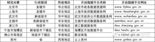 為開展此次評估調(diào)研,研究首先通過媒體報道、官方報道的途徑查詢了解到北京、上海、武漢、無錫、佛山南海這5個地方的開放政府數(shù)據(jù)實踐,再通過搜索引擎以“數(shù)據(jù)+gov.cn”和“data+gov.cn”為關(guān)鍵詞查詢到了另外8個地方的開放政府數(shù)據(jù)實踐??紤]到各地方開放政府數(shù)據(jù)實踐的成熟度、相關(guān)資訊完善度、地方行政層級和地域的多樣性,本次評估首先從13個地方中選取了北京市、上海市、武漢市、無錫市、湛江市、寧波市海曙區(qū)、佛山市南海區(qū)等7個地方作為評估樣本,并最終考慮到當前社會關(guān)注度,將貴州的“云上貴州”項目也納入研究對象(參見表1)。