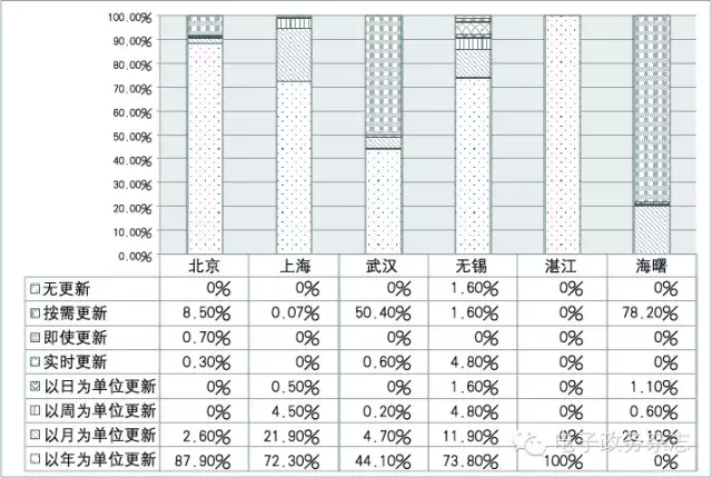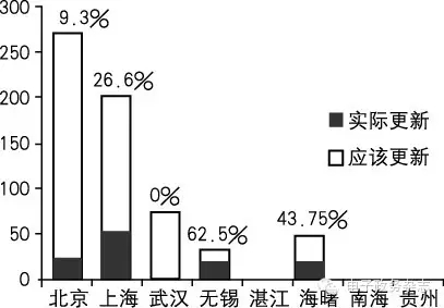 開放政府數(shù)據(jù)并非以數(shù)據(jù)釋放為終點,對于數(shù)據(jù)的更新維護也是開放政府數(shù)據(jù)項目的重要工作。研究評估發(fā)現(xiàn),目前8個地方的開放政府數(shù)據(jù)項目雖然已經(jīng)發(fā)布近2000個數(shù)據(jù)集,但其中僅有17.21%的數(shù)據(jù)按時得到更新,大量數(shù)據(jù)雖然清晰標明了更新頻率但是均未真正兌現(xiàn)承諾,這使得開放政府數(shù)據(jù)無法作為穩(wěn)定、可靠的數(shù)據(jù)源被應(yīng)用于產(chǎn)品之中。