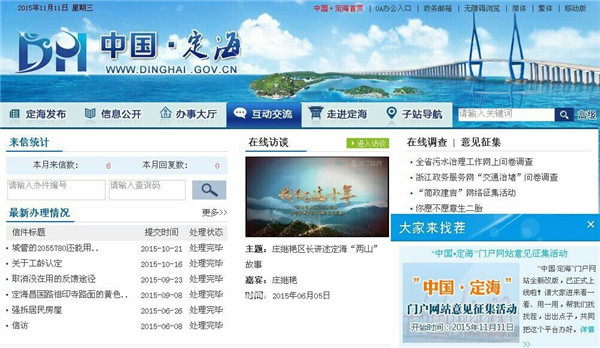 今天(11月11日),“中國·定海”政府門戶網(wǎng)站經(jīng)過改版全新上線,新版涵蓋定海發(fā)布、信息公開、辦事大廳、互動交流、走進定海、子站導(dǎo)航6大版塊,融入更多新技術(shù)與新元素,增強政府門戶網(wǎng)站的全面性、實用性、服務(wù)性和規(guī)范性。