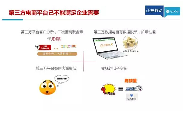 問(wèn)題來(lái)了,移動(dòng)電商是自建和嫁接?實(shí)際上,第三方電商平臺(tái)已經(jīng)不能滿足需求。第三方平臺(tái)客戶分散、二次營(yíng)銷取舍難,客戶忠誠(chéng)度底,用戶往往是平臺(tái)的用戶,不是企業(yè)的。此外,變味的電商,刷單才有銷量,要銷量就要刷單,已經(jīng)是惡性循環(huán)。