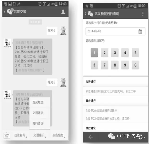 2013年9月5日,“武漢交警”完成了微信平臺1.1版本升級,推出了位于“交通路況”菜單內(nèi)的過江限行查詢功能,當(dāng)日用戶增長量突破1萬?!跋扌胁樵儭惫δ苁悄壳啊拔錆h交警”微信平臺內(nèi)使用率最高的服務(wù)項(xiàng)目,過江限行查詢的基本操作為:輸入“車牌尾號”或點(diǎn)擊菜單“限行查詢”即可獲知當(dāng)日車輛是否可過江。該操作很簡明,有效解決了廣大駕駛員在面對交管部門復(fù)雜的限行規(guī)定時(shí),難以快速準(zhǔn)確了解自己所駕駛車輛是否能夠通行特定限行橋隧的問題,進(jìn)而幫助駕駛員提前規(guī)劃好行車路線,避免無意違章行為的發(fā)生(參見圖1)。