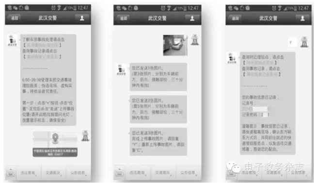 “武漢交警”政務(wù)微信是由武漢交管部門與騰訊大楚網(wǎng)合作開發(fā)完成,其目的在于為武漢超過240萬的駕駛員提供更智能的交通服務(wù),進(jìn)而深度解決民生問題,實(shí)行指尖上的政民互動?!拔錆h交警”微信平臺通過1。0版本到3。0版本的不斷系統(tǒng)升級,將其提供的功能從信息推送逐步演化為信息查詢、快速理賠以及最終的微信支付繳納罰款,從而實(shí)現(xiàn)了完整的閉環(huán)式的在線公共服務(wù)。