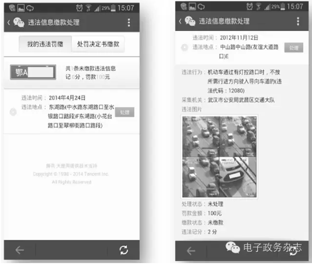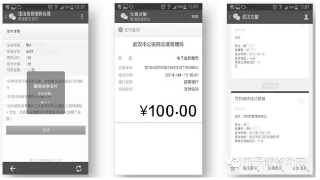 2014年5月26日,由騰訊大楚網(wǎng)與武漢市公安局交通管理局聯(lián)合開發(fā)推出“武漢交警”3。0版本微信支付交通違法罰款功能?!拔錆h交警”成為全國首例支持微信支付繳納罰單的政務(wù)微信公眾賬號。用戶關(guān)注“武漢交警”微信公眾賬號并綁定個(gè)人信息后,當(dāng)車輛出現(xiàn)交通違法現(xiàn)象,就可以及時(shí)收到交管部門主動推送的信息提醒,用戶可以通過微信平臺查詢自己的詳細(xì)違法記錄,包括違法時(shí)間、違法地點(diǎn)、違法行為、采集機(jī)關(guān)、4張不同角度拍攝的違法圖片、罰款金額以及違法記分等信息都會清晰顯示。在核實(shí)信息后,用戶即可微信支付“處理”罰單,支付成功后,“武漢交警”還會推送“罰款繳納成功提醒”,包含車主姓名、車牌號、違法地點(diǎn)、駕駛證扣分情況等,讓車主對自己的罰單繳納記錄一目了然(參見圖3、圖4)。