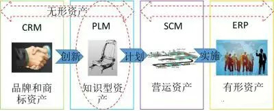 當(dāng)前制造業(yè)企業(yè)中普遍存在著四種主要的資產(chǎn)管理的需求,分別是品牌、商標(biāo)資產(chǎn)、知識型資產(chǎn)、營運(yùn)資產(chǎn)和有形資產(chǎn)。這四種資產(chǎn)在當(dāng)前制造業(yè)從工業(yè)3.0向工業(yè)4.0階段的過渡時期對應(yīng)的信息化管理技術(shù)分別是CRM、PLM、SCM、ERP。