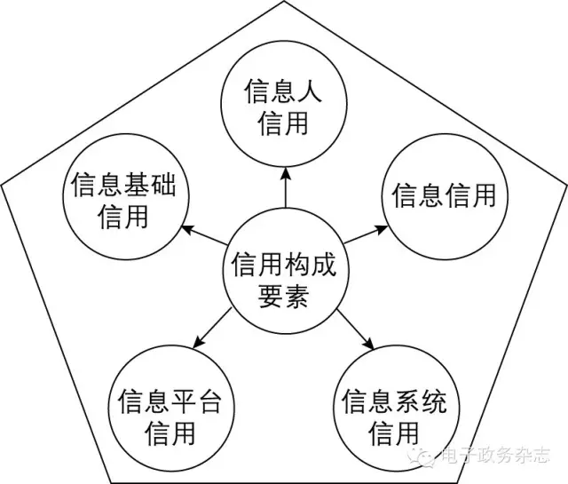 信息平臺依靠信息基礎(chǔ)建設(shè),是信息系統(tǒng)和信息的載體,也是信息人操作的工具和對象。狹義的信息平臺僅包括網(wǎng)絡(luò)平臺、存儲平臺和應(yīng)用平臺,而廣義的信息平臺還包括硬件設(shè)備、程序系統(tǒng)和人。所以,信息平臺信用可涵蓋信息平臺狹義范疇中各要素的信用,也可涵蓋信息平臺廣義范疇中各要素的信用。此外,基于以下考慮,信息平臺信用的外延還有擴(kuò)展的必要:其一,電子政府構(gòu)建旨在建設(shè)開放統(tǒng)一的信息平臺,這就必然要求各級政府及其部門進(jìn)行跨地區(qū)、跨層級、跨部門合作,共建共享,互聯(lián)互通,業(yè)務(wù)協(xié)同。如此,信息平臺信用就必然涉及參與其中的各級政府及其部門的信用,其中任何一方的信用缺失和行為失范都會影響到整體信用,需要建立工作標(biāo)準(zhǔn)和行為規(guī)則來約束。因此,平臺的工作標(biāo)準(zhǔn)、行為規(guī)則以及整合在平臺上的各級政府及其部門的信用也將成為信息平臺信用的構(gòu)成要素。其二,統(tǒng)一的信息平臺需要以資源共享和業(yè)務(wù)協(xié)同作支撐,由此可見,各級政府部門所提供資源的信用,以及業(yè)務(wù)協(xié)同中各部門的信用,連同辦事流程的信用也應(yīng)成為信息平臺信用的構(gòu)成要素。其三,信息平臺依靠IT企業(yè)建設(shè)和運(yùn)維,也需要政府內(nèi)部事業(yè)編制的技術(shù)部門支持,因而企業(yè)和技術(shù)部門的信用將直接影響信息平臺的質(zhì)量和績效。