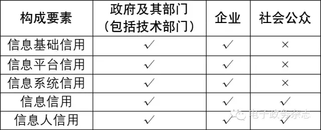 在大數(shù)據(jù)時代,政府可以獲取大量有關(guān)自身、其他政府及其部門、企業(yè)和社會公眾的信用狀況記錄,但這些記錄并不一定是客觀的,還混雜有主觀的成分,需要政府在進(jìn)行管理和決策的過程中深入挖掘、辨識和使用。如何確定數(shù)據(jù)信用以及保證據(jù)此做出的管理和決策公平公正是政府的職責(zé)所在,但取決于政府的能力。政府不得不依靠其他組織,與企業(yè)和社會公眾建立良好的合作關(guān)系,表1中顯示了電子政府信用關(guān)系的各個承載者。其中,社會公眾雖不是信息基礎(chǔ)、信息平臺、信息系統(tǒng)的直接建設(shè)者和運(yùn)維者,卻因廣泛滲透與頻繁使用信息基礎(chǔ)、信息平臺和信息系統(tǒng),而成為其不可或缺的信用主體。