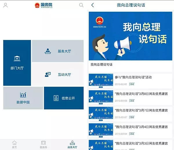 2016年2月,定位于發(fā)布政務(wù)信息和提供在線服務(wù)的新媒體平臺國務(wù)院客戶端開通上線,中央人民政府走近了公民的"身邊",界面清新、訪問流暢、交互性強,億萬公民可以通過這個APP第一時間掌上獲取各種政務(wù)信息、國務(wù)院動態(tài)、領(lǐng)導人觀點……客戶端的開通創(chuàng)新了政務(wù)信息公開方式、擴大了政務(wù)公開參與渠道。其中"我向總理說句話"圍繞民生領(lǐng)域羅列了簡政放權(quán)、宏觀調(diào)控、互聯(lián)網(wǎng)+、教育公平等多個分類,網(wǎng)民可以選取關(guān)心的話題向總理建言獻策,客戶端也對每日優(yōu)秀建言進行了及時整理與公開,"與總理對話"現(xiàn)已成為億萬網(wǎng)民最火熱的政民互動方式。