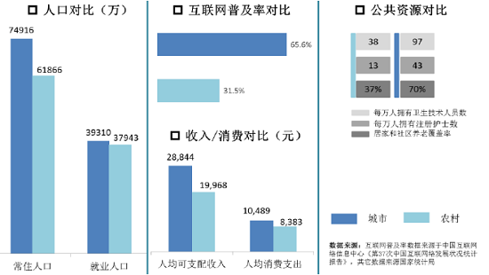 鄉(xiāng)村人口在消費水平,教育、醫(yī)療等公共服務(wù)以及網(wǎng)絡(luò)基礎(chǔ)設(shè)施方面與城鎮(zhèn)居民都存在較大差距。2014年,鄉(xiāng)村人口規(guī)模降至6.2億,接近城鎮(zhèn)人口規(guī)模,但人均可支配收入?yún)s不足城鎮(zhèn)居民的4成。農(nóng)村居民消費水平為0.87萬,僅占城鎮(zhèn)居民的34.4%;農(nóng)村每萬人擁有的衛(wèi)生技術(shù)人員、注冊護(hù)士和醫(yī)療機構(gòu)床位數(shù)與城鎮(zhèn)居民的比例均在30.0%-45.0%區(qū)間;城鎮(zhèn)與農(nóng)村地區(qū)的互聯(lián)網(wǎng)普及率分別為64.2%、30.1%,相差34.1個百分點。