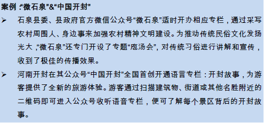 政民交流互動,收集民意:微信公眾平臺提高了農(nóng)村事務(wù)的知曉率,也提高了村民的參與度,有利于民情收集。例如,鴻山鎮(zhèn)伍堡村委會每月都會在微信上收到村民對村務(wù)工作的意見和建議,并將匯總的意見和反饋情況在微信上公開,極大提高了村民的滿意度;圍頭村根據(jù)公眾號收集到的來自游客的反饋和建議,創(chuàng)新了首個民宿試點、戰(zhàn)地食堂等多個旅游產(chǎn)品,有力地提高了景區(qū)的吸引力。據(jù)統(tǒng)計,當(dāng)年來圍頭灣的游客總量達(dá)到75萬人次。