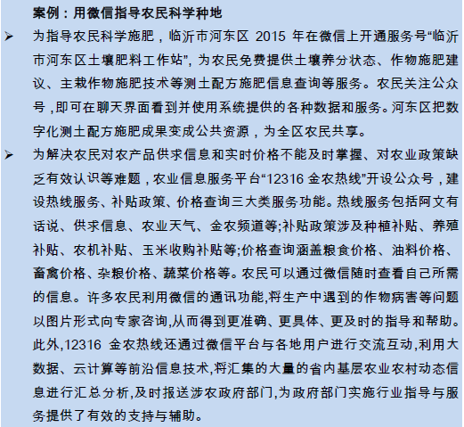靠經(jīng)驗種田、市場信息不對稱的時代正在遠(yuǎn)去:微信通過服務(wù)號和訂閱號實現(xiàn)了農(nóng)民與專家、農(nóng)民與市場的連接,逐步形成了集農(nóng)業(yè)信息發(fā)布、農(nóng)產(chǎn)品宣傳、農(nóng)資信息查詢和農(nóng)業(yè)生產(chǎn)咨詢服務(wù)為一體的綜合移動服務(wù)窗口,為農(nóng)民開展農(nóng)業(yè)生產(chǎn)活動提供專業(yè)指導(dǎo)。