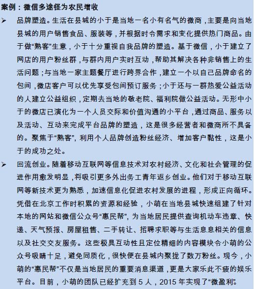 移動互聯(lián)時代,數(shù)字成本降低惠及了更多不發(fā)達(dá)地區(qū),擴(kuò)大了數(shù)字技術(shù)的擴(kuò)散半徑。截至2015年12月,農(nóng)村網(wǎng)民規(guī)模達(dá)1.95億,占農(nóng)村總?cè)丝诘?1.5%。其中,即時通信工具的使用率第一,比例為87.2%1。微信作為用戶數(shù)最多的社交平臺,在三農(nóng)中的應(yīng)用日益深入,從工具到平臺,從信息到服務(wù)。