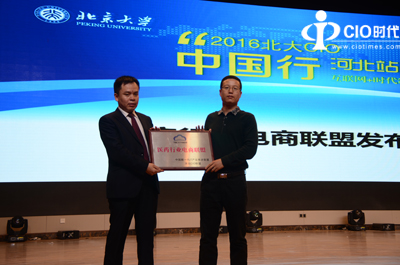 本次活動的最后環(huán)節(jié)為“河北醫(yī)藥行業(yè)電商聯(lián)盟”授牌儀式,北大CIO同學會副會長、北京中機盛科軟件有限公司副總經(jīng)理、冀凱集團信息總監(jiān)齊亞卓先生對河北醫(yī)藥電商聯(lián)盟進行授牌。