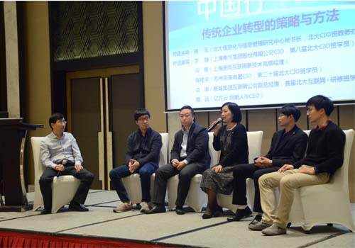 接下來進行的是主題為《傳統(tǒng)企業(yè)互聯(lián)網(wǎng)轉(zhuǎn)型的策略與方法》的對話主題環(huán)節(jié)。對話環(huán)節(jié)由北大信息化與信息管理研究中心秘書長、北大CIO班教務(wù)辦主任姚樂主持,上海電氣集團股份有限公司CIO、第八屆北大CIO班學(xué)員、上海CIO聯(lián)盟執(zhí)行理事長李靜,上海通用互聯(lián)網(wǎng)新技術(shù)高級經(jīng)理向騫,蘇州未來電器CIO、第二十屆北大CIO班學(xué)員陳桂平,新城集團互聯(lián)網(wǎng)公司副總經(jīng)理、首屆北大互聯(lián)網(wǎng)+研修班學(xué)員從申,億方云創(chuàng)始人&CEO程遠參與了對話研討,從自身企業(yè)角度紛紛發(fā)表自己關(guān)于互聯(lián)網(wǎng)轉(zhuǎn)型的策略與方法的不同見解,并積極回復(fù)現(xiàn)場嘉賓的提問,使現(xiàn)場氣氛達到新的高潮。