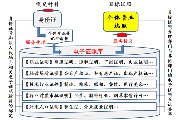 “一號(hào)”申請(qǐng)與電子證照互認(rèn)共享業(yè)務(wù)流程。以辦理個(gè)體營(yíng)業(yè)執(zhí)照為例:申請(qǐng)人到工商所提交身份證件,填寫《個(gè)體開業(yè)登記申請(qǐng)書》,由于相關(guān)的職業(yè)證明、經(jīng)營(yíng)場(chǎng)所證明、技術(shù)行業(yè)證件、行業(yè)前置審批證明、外來(lái)人口證明等各類批文、證件、證明材料等,均已在電子證照庫(kù)中,并已與身份證件綁定,只要工商部門與其他相關(guān)部門實(shí)現(xiàn)各類電子證照基礎(chǔ)材料的互認(rèn)共享,即可方便地辦理個(gè)體營(yíng)業(yè)執(zhí)照(見圖2)。在以往條件下,辦理這樣的證照,申請(qǐng)人需要攜帶圖中的各類證照材料,并必須證明各類證照材料與申請(qǐng)人的關(guān)聯(lián)性,為此需要在多個(gè)部門之間“來(lái)回跑”。實(shí)施“一號(hào)”申請(qǐng)的惠民模式,通過(guò)對(duì)身份證號(hào)和法人代碼的服務(wù)受理,實(shí)現(xiàn)身份證號(hào)和法人代碼與各類證照材料的互認(rèn)共享,即可快速完成電子證照的服務(wù)提交,變“群眾來(lái)回跑”為“部門協(xié)同辦”,為社會(huì)公眾提供便捷的惠民服務(wù)。