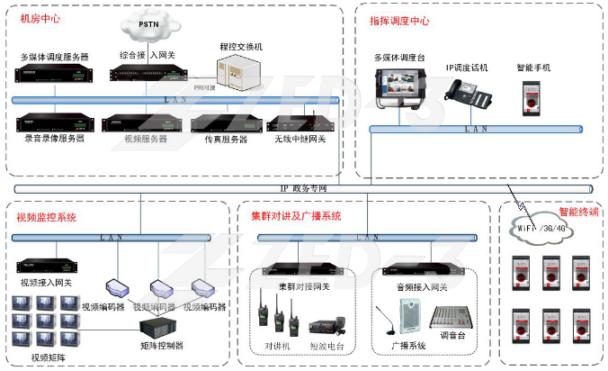 捷思銳政府應(yīng)急指揮平臺依托電子政務(wù)專網(wǎng),將各種通信終端接入綜合指揮調(diào)度系統(tǒng),進行統(tǒng)一的呼叫調(diào)度和錄音,并提供與業(yè)務(wù)系統(tǒng)、地理信息系統(tǒng)、短信平臺的對接。綜合指揮調(diào)度系統(tǒng)融合了PSTN公共交換電話網(wǎng)、集群通信系統(tǒng)、公眾移動通信系統(tǒng)、多路傳真系統(tǒng)、視頻調(diào)度系統(tǒng)、音響廣播系統(tǒng)等。