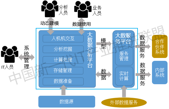 我們先看未來走到哪里。大數(shù)據(jù)的發(fā)展最終是智慧化,所以未來應該是以服務的方式嵌入到具體的業(yè)務中去。所以未來企業(yè)都應該有一個大數(shù)據(jù)服務平臺,這個大數(shù)據(jù)服務平臺通過實時的計算處理,實時響應各業(yè)務系統(tǒng)所需要的數(shù)據(jù)服務。大數(shù)據(jù)服務平臺需要的數(shù)據(jù)、算法模型又從哪里來呢?答案就是大數(shù)據(jù)分析平臺,分析平臺包括數(shù)據(jù)準備、存儲管理、計算處理、分析挖掘、人機交互等內(nèi)容。也就是從未來的企業(yè)大數(shù)據(jù)平臺包括大數(shù)據(jù)分析平臺和服務平臺。分析平臺著重是離線數(shù)據(jù)的加工處理、算法模型的研發(fā)以及實現(xiàn)挖掘結果的交互;而服務平臺著重在在線數(shù)據(jù)服務,直接為各業(yè)務環(huán)節(jié)提供在線的數(shù)據(jù)服務。如下圖所示: