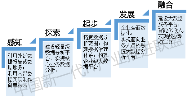 起步階段,拓寬數(shù)據(jù)分析應用范圍,在織織數(shù)據(jù)化發(fā)展到一起基礎的前提下,建設數(shù)據(jù)治理體系,著手建設企業(yè)級大數(shù)據(jù)分析平臺。