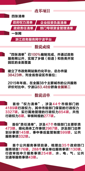 2014年,全省開(kāi)始以“四張清單一張網(wǎng)”為重點(diǎn)的政府自身改革。作為改革前沿陣地的寧波,自然是一馬當(dāng)先,全力推進(jìn)政府權(quán)力清單、企業(yè)投資負(fù)面清單、政府責(zé)任清單、部門(mén)專(zhuān)項(xiàng)資金管理清單及浙江政務(wù)服務(wù)網(wǎng)寧波平臺(tái)的建設(shè)。