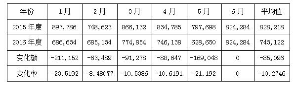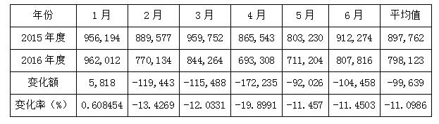 2016年1-6月,日本的電子信息產(chǎn)品進(jìn)口額除6月份外均高于出口額,維持在平均每月0.798萬億日元,1月份為峰值,然后逐漸下降。該變化趨勢受工業(yè)電子設(shè)備影響較大,電子元器件與民用電子設(shè)備的進(jìn)口額變化比較平穩(wěn)(參見圖2)。相較去年同期,除1月份略有增長以外,其余月份均呈現(xiàn)比較明顯的下降趨勢,平均降幅達(dá)到11.09%(參見表1)。