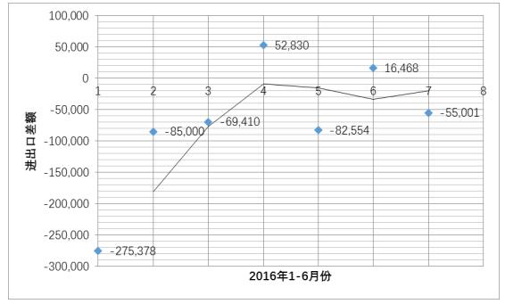 圖5 2016年1-6月日本電子產(chǎn)品進(jìn)出口差額及差比(單位:百萬日元)