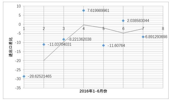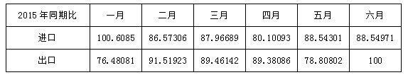 2016年1月貿(mào)易逆差比較明顯,進(jìn)出口差比達(dá)到28.62%,隨后進(jìn)出口差距減小,4月與6月還分別實現(xiàn)了貿(mào)易順差,單從電子信息產(chǎn)品進(jìn)出口來看,貿(mào)易狀況總體呈現(xiàn)漸好的趨勢(參見圖4、圖5)。但是對比去年同期進(jìn)出口總額發(fā)現(xiàn),截至6月,除1月進(jìn)口與6月出口額同去年基本持平外,其余各月進(jìn)出口總額均有明顯下降,最高降幅達(dá)到23.52%,同去年總體進(jìn)出口額呈現(xiàn)增長態(tài)勢相比,今年上半年貿(mào)易規(guī)模明顯萎縮,說明2014年開始,通過提高工資水平刺激國內(nèi)消費與進(jìn)口的政策紅利已過,整體電子信息產(chǎn)品貿(mào)易呈現(xiàn)下行趨勢(參見表3)。