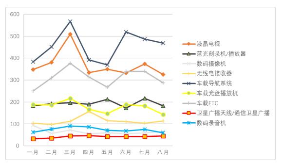 2016年1-8月車載導(dǎo)航系統(tǒng)、液晶電視的出貨量相對較高,波動性大,均在3月達(dá)到峰值,分別為56.7萬臺和51萬臺,相比2015年峰值出貨量分別下降近10萬臺。但車載導(dǎo)航系統(tǒng)1-8月的平均出貨量相比去年同期增長了4.87%,而液晶電視則下降8.83%。 車載ETC、藍(lán)光刻錄機(jī)/播放器和車載光盤播放機(jī)出貨量相對居中,其中車載ETC的波動較大,峰值較去年增長了近2萬臺,1-8月平均出貨量增長率最高,達(dá)到13.63%,另外兩者變化較為平緩,平均出貨量均呈現(xiàn)下降趨勢。數(shù)碼攝像機(jī)、無線電接收器、衛(wèi)星廣播天線和數(shù)碼錄音機(jī)的出貨量相對較低,除無線電接收器波動較大外,其余變化均相對平緩,四種產(chǎn)品出貨量相比去年同期也呈現(xiàn)下降趨勢,其中數(shù)碼錄音機(jī)降幅最大,達(dá)到21.12%(參見圖6、表4)。從日本主要消費電子設(shè)備的國內(nèi)出貨量來看,整體狀況同產(chǎn)值、進(jìn)出口貿(mào)易趨勢類似,呈現(xiàn)萎縮態(tài)勢,車載導(dǎo)航系統(tǒng)和ETC憑借海外良好的銷售狀況出貨量繼續(xù)增長。