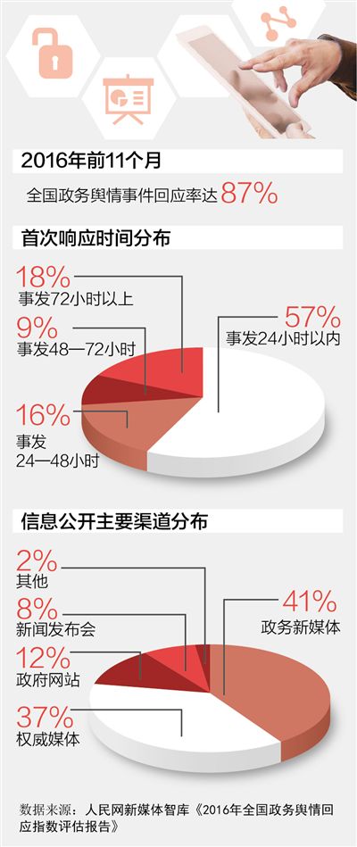 人民網(wǎng)新媒體智庫分析顯示,2016年1月—11月的600多起輿情案例中,政府回應率達到87%,有57%以上的事件政府首次響應在事發(fā)24小時之內,有73%的事件政府部門首次回應在48小時之內(含24小時)。其中,41%的事件通過政務新媒體作出回應(右圖)。