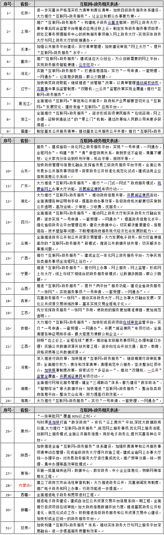 注:以上數(shù)據(jù)由國脈系蟠桃會獨家匯總整理。其中內(nèi)蒙古僅在2016年工作回顧中提及“電子政務(wù)”,其余30個省區(qū)市均在2017年重點工作中提及了“互聯(lián)網(wǎng)+政務(wù)”相關(guān)。
