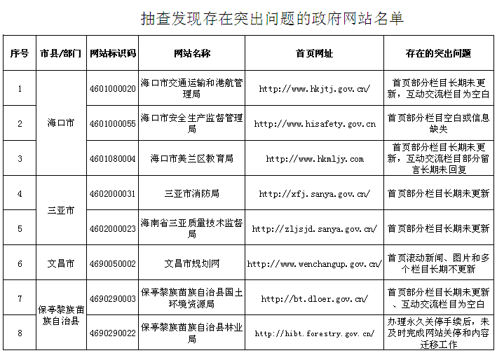 抽查發(fā)現(xiàn)基層政府網(wǎng)站存在問題較多?!皷|方農(nóng)業(yè)信息網(wǎng)”主頁(yè)無法訪問;“海口市交通運(yùn)輸和港航管理局”、“三亞市消防局”、“三亞質(zhì)量技術(shù)監(jiān)督局”和“文昌市規(guī)劃網(wǎng)”網(wǎng)站多個(gè)欄目長(zhǎng)期未更新;“??谑忻捞m區(qū)教育局”網(wǎng)站2015年8月收到2條網(wǎng)民咨詢,至今仍未答復(fù);“海口市安全生產(chǎn)監(jiān)督管理局”網(wǎng)站存在空白欄目,部分欄目信息缺失。