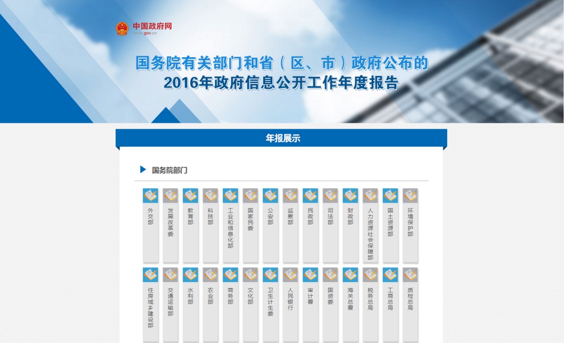 2016年政府信息公開(kāi)工作年度報(bào)告展示平臺(tái) 來(lái)源:中國(guó)政府網(wǎng)