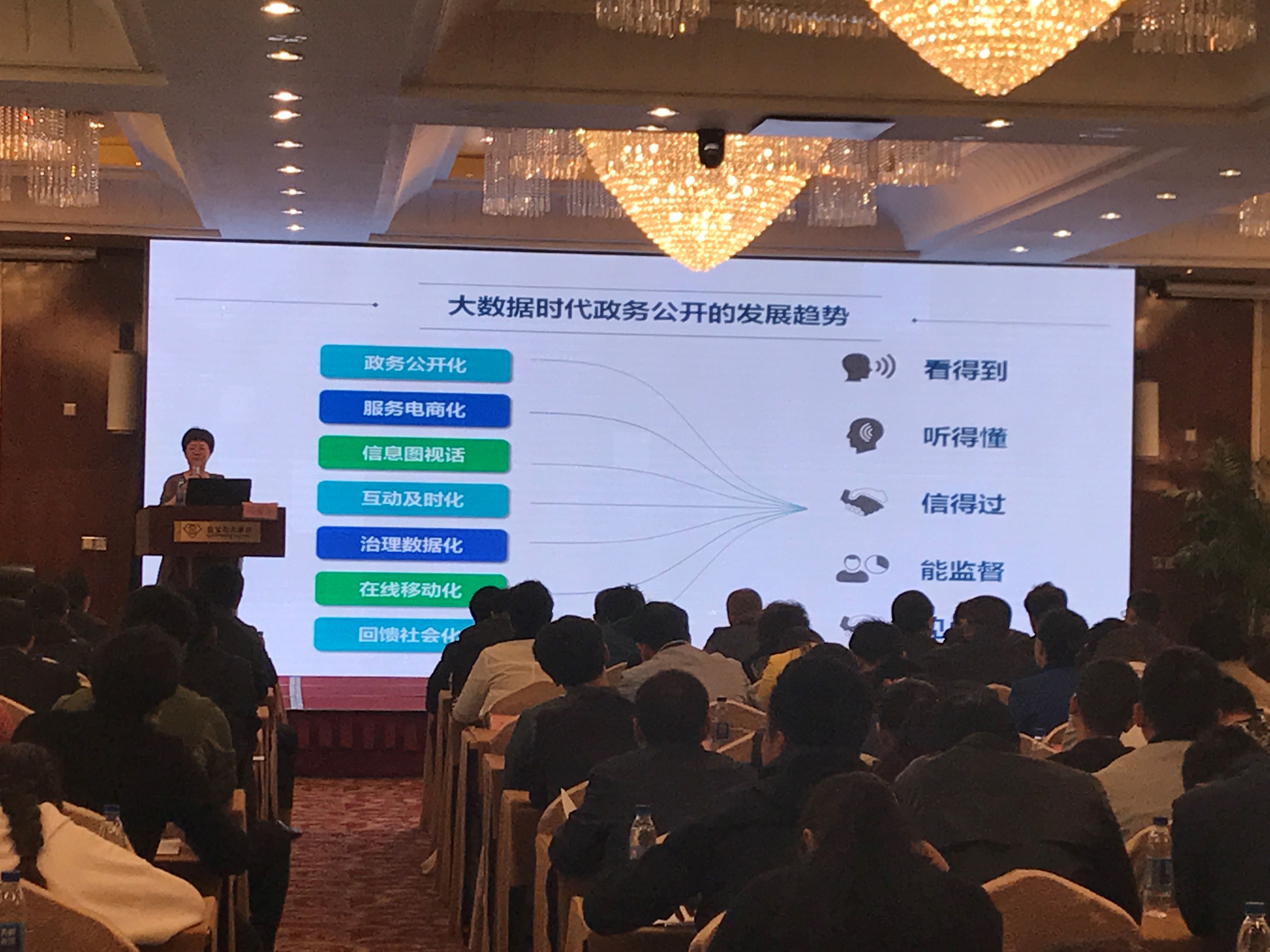 北京國脈互聯(lián)信息顧問有限公司總經(jīng)理、首席規(guī)劃師鄭愛軍出席會議,并以《大數(shù)據(jù)背景下政務公開工作思考》為主題演講,她從大數(shù)據(jù)產(chǎn)生的背景、動力及特征,互聯(lián)網(wǎng)+政務服務與大數(shù)據(jù)發(fā)展現(xiàn)狀,政務公開在行動,政務公開平臺的構(gòu)建策略與發(fā)展建議四個方面做了精彩解析。針對大數(shù)據(jù)時代政務公開怎么做的問題,鄭總提出,一是集約化,建設政務公開信息矩陣、服務矩陣、特色矩陣;二是平臺化,加強政策文件解讀、落實與監(jiān)督;三是O2O化,建立線上線下政民互動強關系;四是智能化,提供便捷包容的政務公開服務;五是產(chǎn)品化,以產(chǎn)品化的思路去除不必要的信息干擾,爆點致勝;六是移動化,塑造政務公開生態(tài)體系。