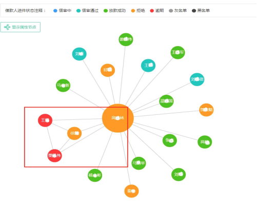 當關聯(lián)信息得到補充(相對于原進件聯(lián)系人,補充了同事、鄰居、親屬、朋友等關系,還基于用戶授權數據進行了深度擴展)后,暫不考慮物品(如手機號、銀行賬號、地址等),僅考慮自然人,獲取徐某二度關系內同時在恒昌網貸平臺有借款行為的用戶,得到圖2(基于同樣原因數據有涂抹及簡化)的結果。該圖每一個圓都代表一位恒昌客戶,圖頂部的狀態(tài)說明了客戶當前所處狀態(tài)。觀察左下角以徐某為中心的四個客戶(已用紅框標出),他們剛好是所呈現圖的最大完全子圖,符合圖論中團的定義。再看除徐某外的三個客戶:兩個逾期、一個被拒。如果徐某是新入圖數據庫的借款人,從數學模型的角度看,幾乎可以直接判定拒絕。因為符合這種狀態(tài)的團,是欺詐團伙或是組團代辦的幾率非常大。