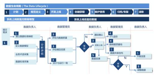 人民銀行與銀監(jiān)會也非常重視數(shù)據(jù)治理,從08年開始,在全國銀行業(yè)推行統(tǒng)一的數(shù)據(jù)標準,控制行業(yè)的數(shù)據(jù)質(zhì)量。工行、建行、國開等大型銀行,對數(shù)據(jù)治理都非常重視。08年前,我們與國開一起開始了數(shù)據(jù)治理的建設(shè),下圖展示的就是國開銀行針對數(shù)據(jù)全生命周期的數(shù)據(jù)管控。