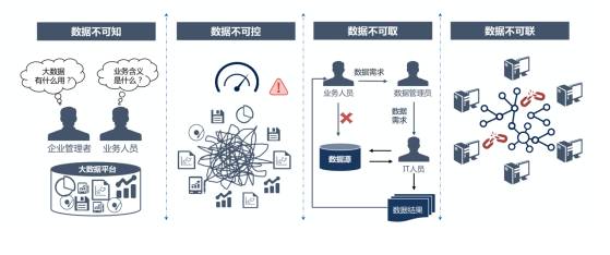 數(shù)據(jù)不可知:用戶不知道大數(shù)據(jù)平臺中有哪些數(shù)據(jù),也不知道這些數(shù)據(jù)和業(yè)務(wù)的關(guān)系是什么,雖然意識到了大數(shù)據(jù)的重要性,但平臺中有沒有能解決自己所面臨業(yè)務(wù)問題的關(guān)鍵數(shù)據(jù)?該到哪里尋找這些數(shù)據(jù)?