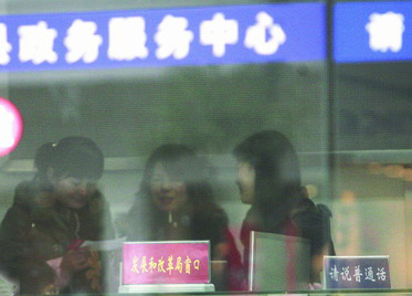 熱鬧的聊天經(jīng)過短暫休止后再次開始。10時零5分,環(huán)保局窗口男子再次點燃了一根煙,“紅衣女子”則顯得格外活躍,與文化體育局的高個男子聊個不停。受他們的影響,文化體育局窗口迅速聚集了縣發(fā)改局、城管局的窗口人員,大家一起加入了聊天的行列。