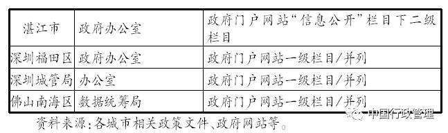 2008年《政府信息公開條例》正式頒布后,我國逐步形成以國務(wù)院辦公廳為全國主管部門,縣級以上地方人民政府辦公廳(室)為主管單位的政府信息公開行政管理體系,政府網(wǎng)站成為信息公開的“第一平臺”。近年來,我國部分地方政府在借鑒英美國家經(jīng)驗(yàn)基礎(chǔ)上,初步建設(shè)了數(shù)據(jù)開放平臺,相關(guān)情況如下表1所示。